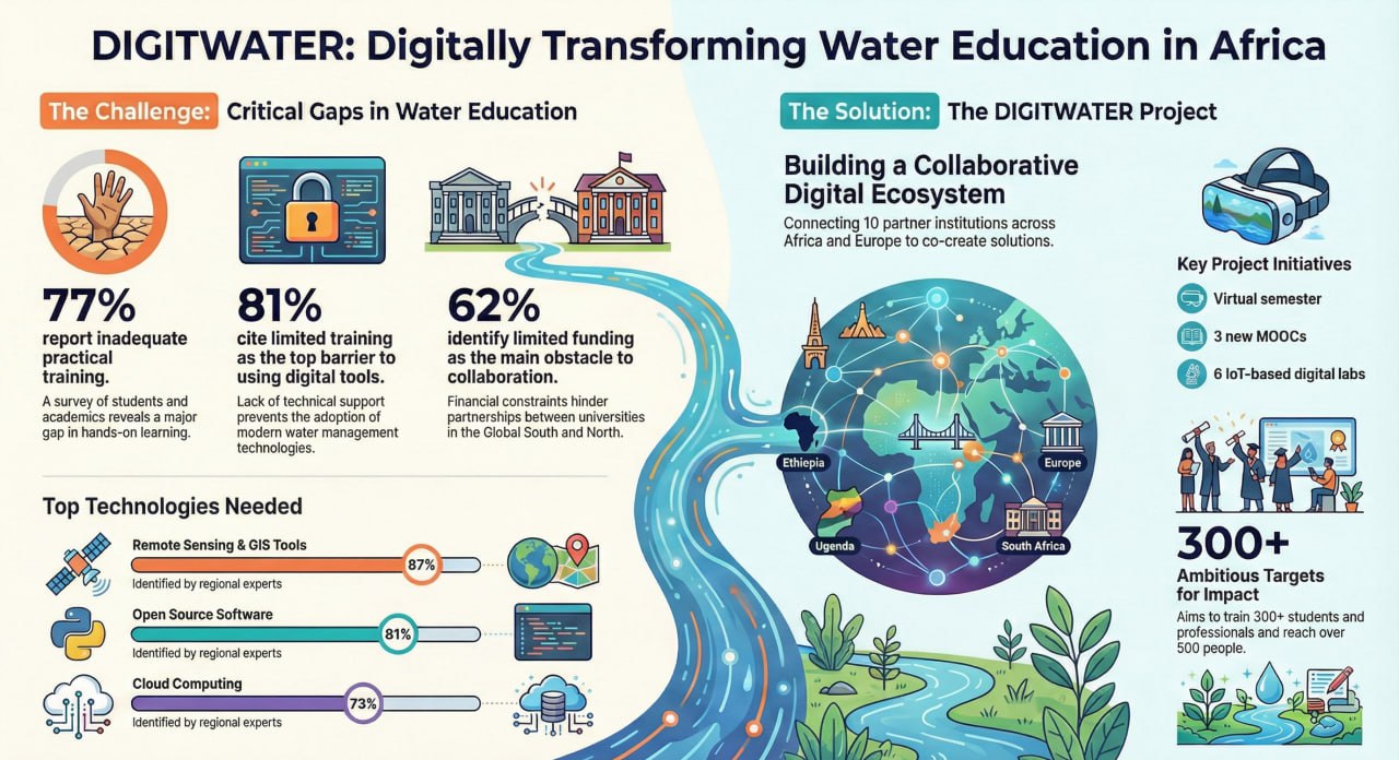 DIGITWATER seeks to enhance the quality, accessibility, and relevance of water education through the adoption of innovative digital technologies. The project focuses on upgrading e-learning platforms, establishing technology laboratories, and developing interactive digital learning resources, including Massive Open Online Courses (MOOCs) in water resources engineering. Through these interventions, the project promotes collaborative learning and knowledge sharing among universities, students, academic staff, and stakeholders from both the public and private sectors. The DIGITWATER Project is designed around four core objectives: