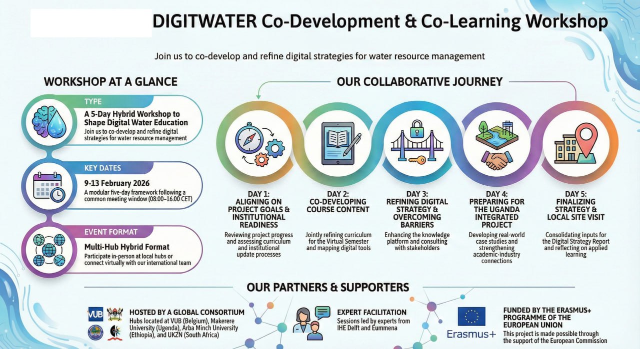 DIGITWATER seeks to enhance the quality, accessibility, and relevance of water education through the adoption of innovative digital technologies. The project focuses on upgrading e-learning platforms, establishing technology laboratories, and developing interactive digital learning resources, including Massive Open Online Courses (MOOCs) in water resources engineering. Through these interventions, the project promotes collaborative learning and knowledge sharing among universities, students, academic staff, and stakeholders from both the public and private sectors. The DIGITWATER Project is designed around four core objectives: