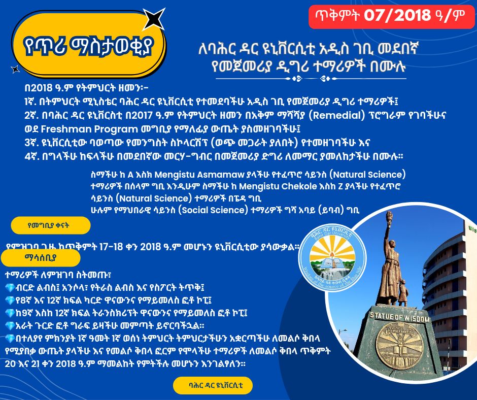 ለባሕር ዳር ዩኒቨርሲቲ አዲስ ገቢ መደበኛ የመጀመሪያ ዲግሪ ተማሪዎች በሙሉ